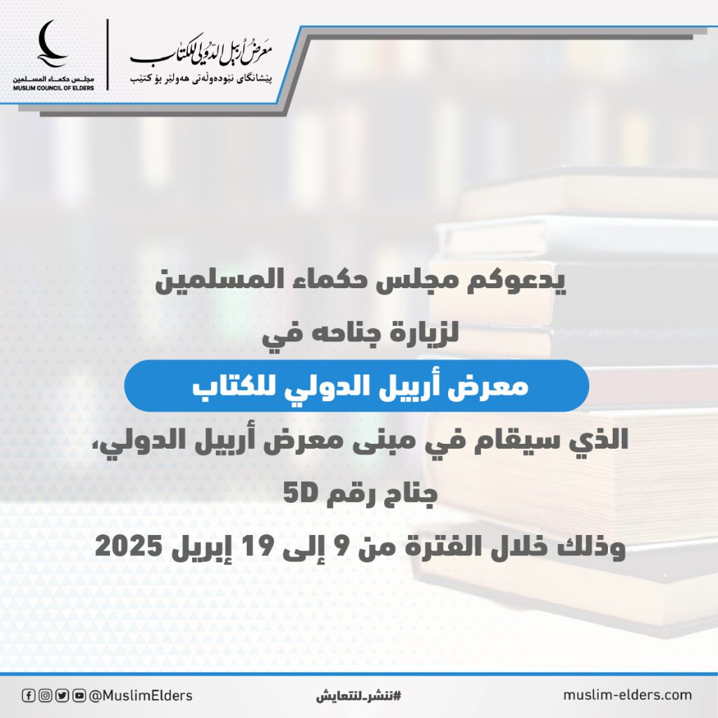 ويقع جناح مجلس حكماء المسلمين بمعرض أربيل الدولي للكتاب، بقاعه D، جناح 5D، خلال الفترة من 9 إلى 19 أبريل 2025.