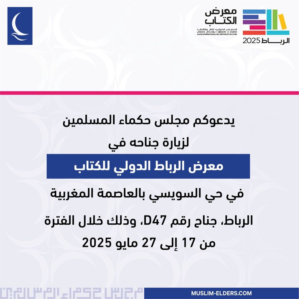 يشارك مجلس حكماء المسلمين بجناحٍ خاصٍّ في الدورة الـ 30 من معرض الرباط الدولي للكتاب، الذي ينعقد خلال الفترة من 17 إلى 27 أبريل 2025؛ وذلك انطلاقًا من رسالة المجلس الهادفة إلى تعزيز السِّلم، وترسيخ قيم الحوار والتَّسامح ومد جسور التعاون والتعايش الإنساني.