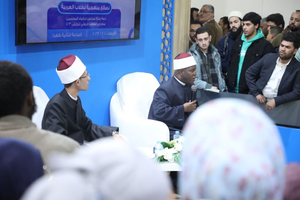 عقد جناح مجلس حكماء المسلمين بمعرض القاهرة الدولي للكتاب، ثامن ندواته الثقافية بعنوان “نصائح منهجية لطلاب العربية”، بمشاركة الشيخ فوزي كوناتي، خريج الأزهر الشريف، وأحد علماء ساحل العاج، تناولت بيان أهمية علوم العربية في التكوين العلمي للباحثين وطلاب العلم.