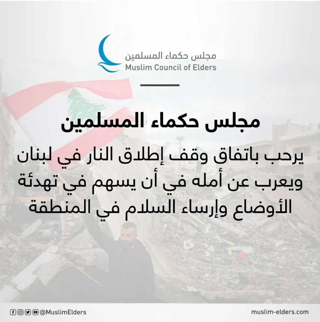 مجلس حكماء المسلمين يرحب باتفاق وقف إطلاق النار في لبنان ويعرب عن أمله في أن يسهم في تهدئة الأوضاع وإرساء السلام في المنطقة