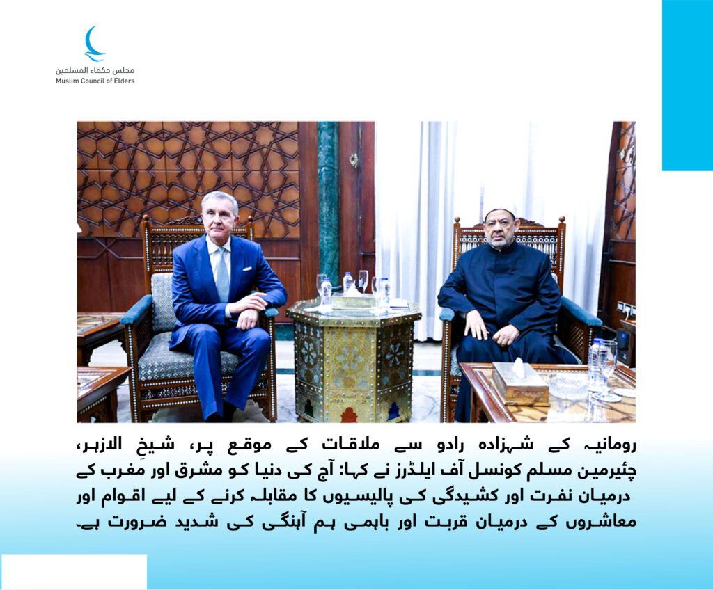 رومانیہ کے شہزادہ رادو سے ملاقات کے موقع پر، شیخِ الازہر، چئیرمین مسلم کونسل آف ایلڈرز نے کہا:آج کی دنیا کو مشرق اور مغرب کے درمیان نفرت اور کشیدگی کی پالیسیوں کا مقابلہ کرنے کے لیے اقوام کے باہمی قریب آنے کی شدید ضرورت ہے۔