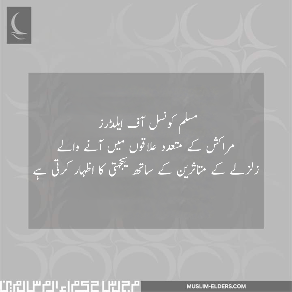 مسلم کونسل اف ایلڈرز کونسل منہدم عمارتوں کے ملبے تلے دبے افراد کو بچانے میں مدد کے لیے فوری اقدام کرنے کی ضرورت پر زور دیتی ہے، خاص طور پر ان علاقوں میں جہاں پہنچنا مشکل ہے، اور متاثرہ افراد کو مدد اور فوری ریلیف فراہم کرنے کے لیے. اور مملکت مراکش کی قیادت، عوام اور متاثرین کے اہل خانہ اور ان کے خاندانوں سے دلی تعزیت کا اظہار کرتی ہے اور دعا گو ہے کہ اللہ تعالیٰ زخمیوں کو صحت کاملہ عطا فرمائے۔