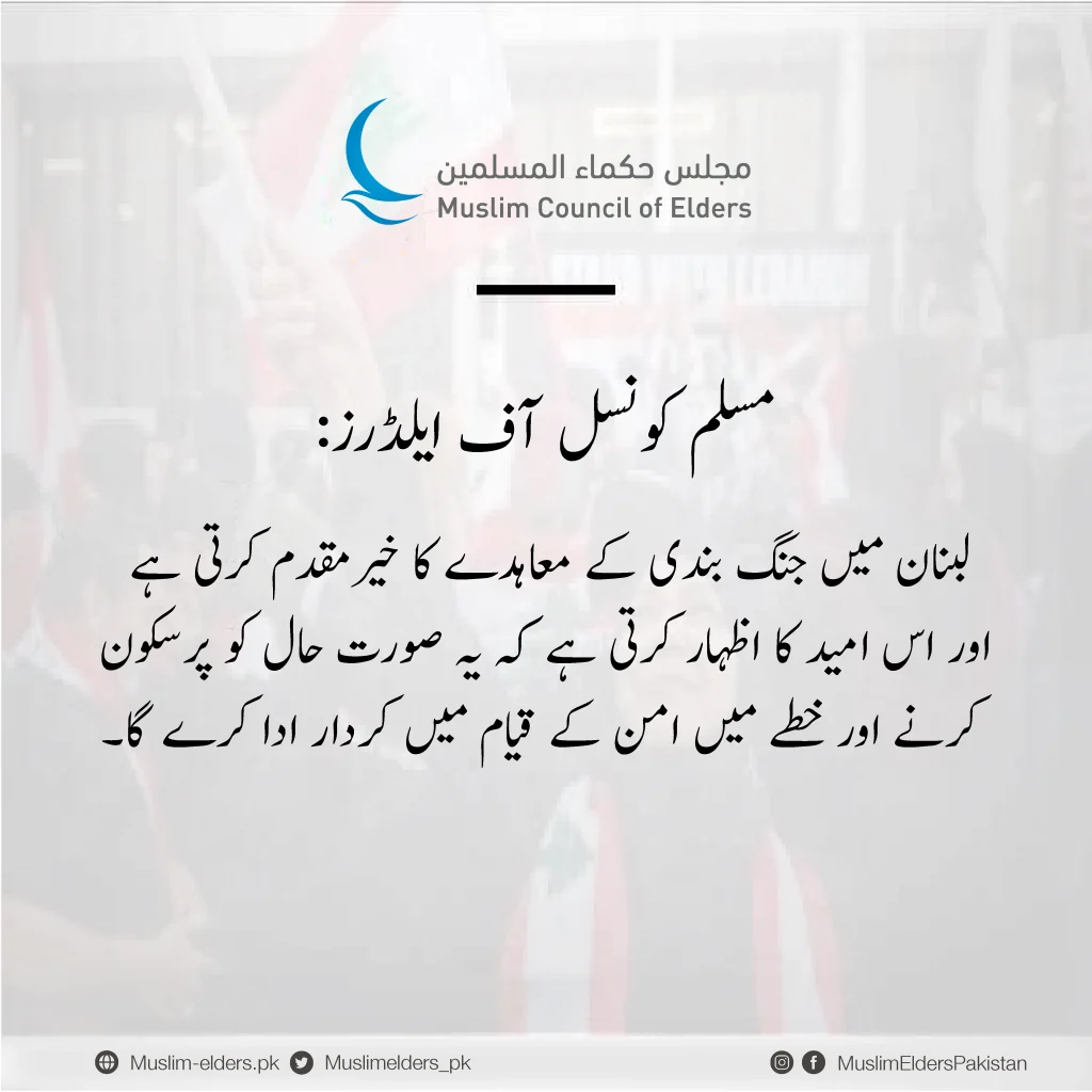 مسلم کونسل اف ایلڈرز لبنان میں جنگ بندی کے معاہدے کا خیرمقدم کرتی ہے اور اس امید کا اظہار کرتی ہے کہ یہ صورت حال کو پرسکون کرنے اور خطے میں امن کے قیام میں کردار ادا کرے گا۔