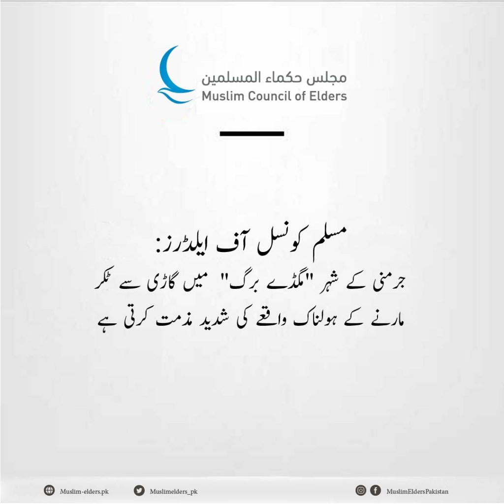 مسلم کونسل آف ایلڈرز جرمنی کے شہر "مگڈے برگ” میں کار کی ٹکر سے ہونے والے ہولناک حادثے کی شدید مذمت کرتی ہے۔