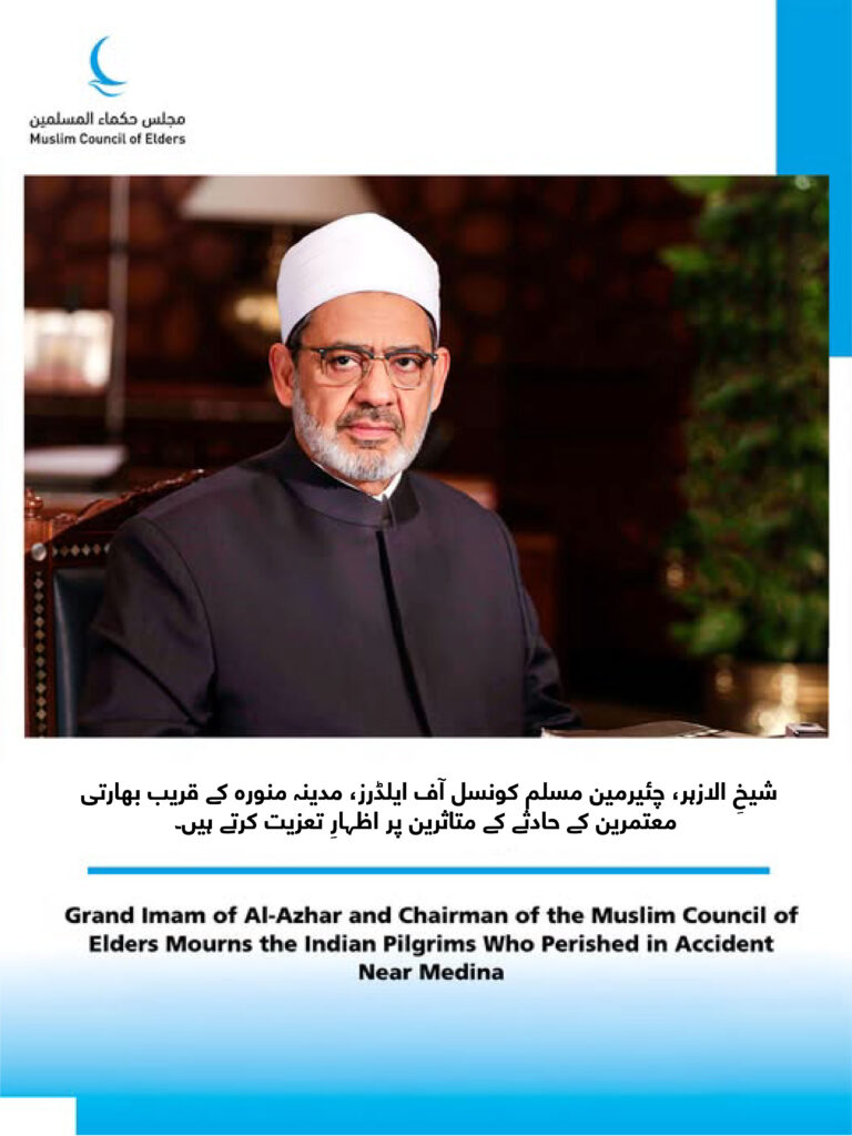 شیخِ الازہر، چئیرمین مسلم کونسل آف ایلڈرز، مدینہ منورہ کے قریب بھارتی معتمرین کے حادثے کے متاثرین پر اظہارِ تعزیت کرتے ہیں۔