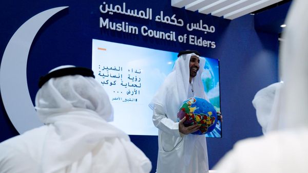 ابوظہبی بین الاقوامی کتاب میلے میں مسلم کونسل آف ایلڈرز کے پویلین میں ایک سمپوزیم میں "انسانی بھائی چارے کی اقدار کو پھیلانے اور فروغ دینے میں عالمی ماڈلز”