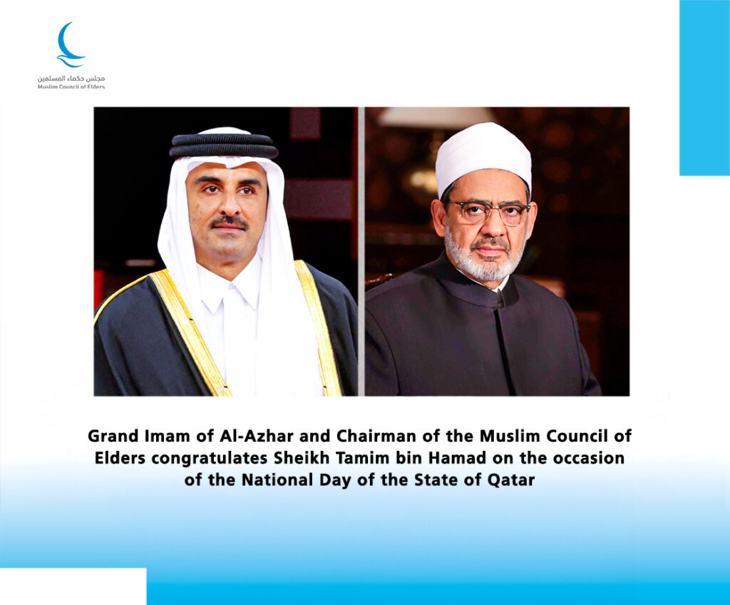 His Eminence Dr. Ahmed Al-Tayeb, the Grand Imam of Al-Azhar and Chairman of the Muslim Council of Elders, extends his warmest congratulations to His Highness Sheikh Tamim bin Hamad Al Thani, Emir of the State of Qatar, and to the people of Qatar on the occasion of the nation’s National Day.