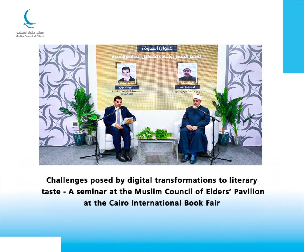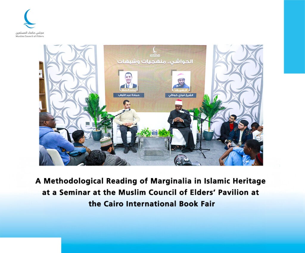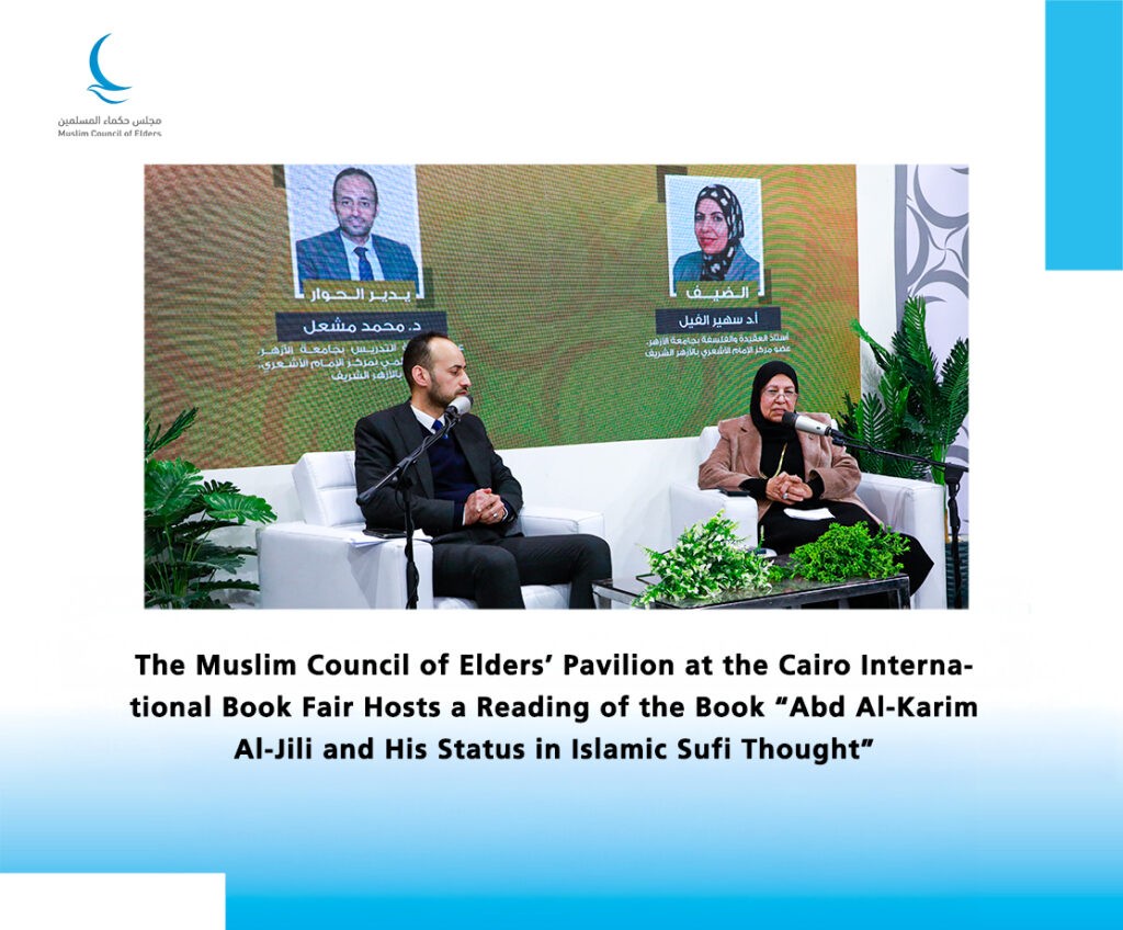 The Muslim Council of Elders’ Pavilion held its ninth cultural seminar at the 57th Cairo International Book Fair, titled “A Reading of the Book ‘Abd Al-Karim Al-Jili and His Status in Islamic Sufi Thought,” authored by Najah Al-Ghanimi. The seminar featured Professor Dr. Suhair Al-Feel, Professor of Creed and Philosophy at Al-Azhar University, and was moderated by Dr. Mohamed Mash’al, faculty member at Al-Azhar University.